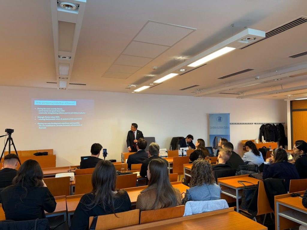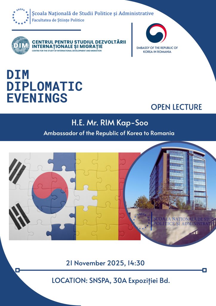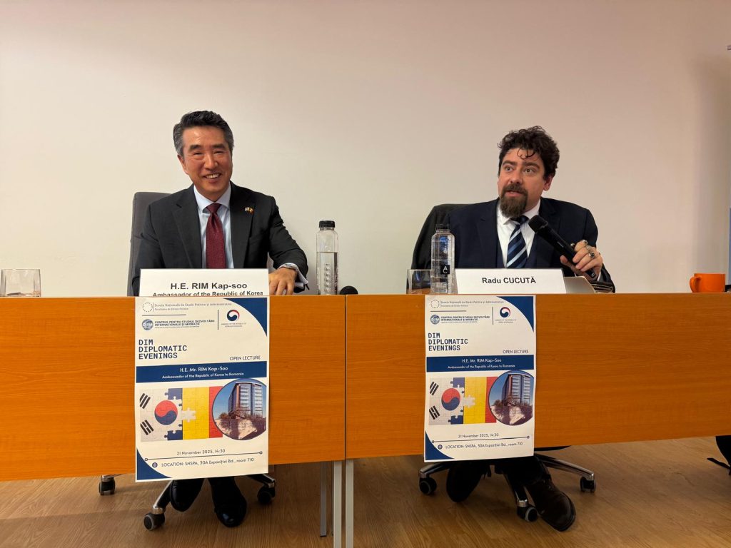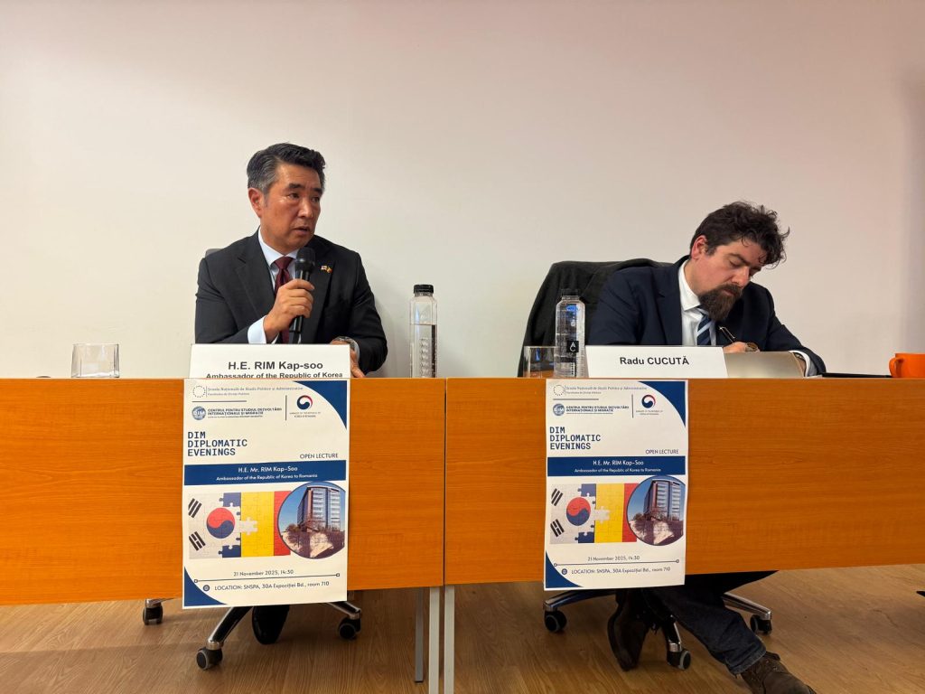 On Friday, November 21, 2025, the Centre for the Study of International Development and Migration (DIM) hosted the second edition of its Diplomatic Evenings series, featuring His Excellency RIM Kap-soo, Ambassador of the Republic of Korea to Romania, as the keynote speaker. The event, moderated by University Lecturer Radu Cucută, PhD, brought together students, faculty members, and representatives of the diplomatic community for an in-depth discussion on the evolving global security environment and the future of Republic of Korea-Romania relations.