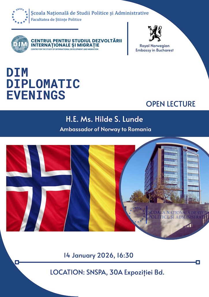 The DIM Diplomatic Evenings are a series of recurring academic and diplomatic events organized by the Faculty of Political Sciences – the Centre for the Study of International Development and Migration (FSP-DIM). The initiative fosters dialogue between the diplomatic corps accredited in Bucharest, the academic community, experts, and the wider public interested in international development and migration.