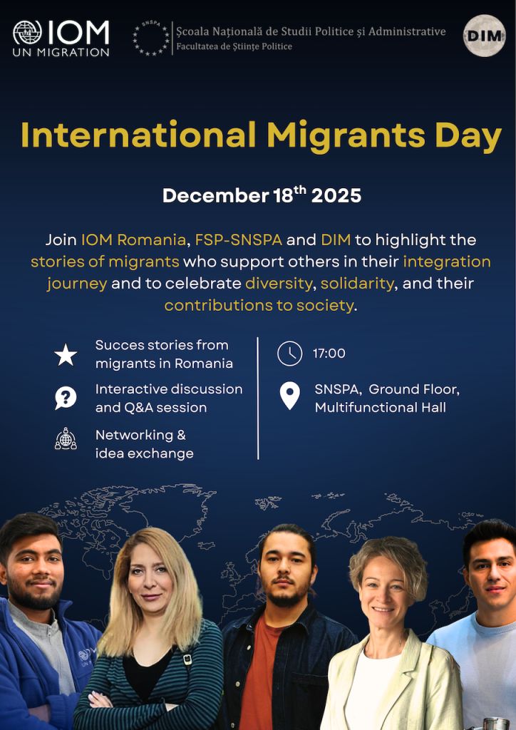 Am marcat Ziua Internațională a Migranților printr-un eveniment dedicat poveștilor reale, experiențelor trăite și dialogului semnificativ despre migrație, integrare și apartenență. Organizat împreună cu OIM România, Facultatea de Științe Politice și Centrul DIM, evenimentul a adus în prim-plan vocile migranților care trăiesc în România și care, prin propriile parcursuri, sprijină activ și îi împuternicesc pe alții în procesul lor de integrare. Poveștile lor au evidențiat migrația nu doar ca pe o provocare, ci și ca pe o sursă de reziliență, solidaritate și contribuție la societate. Prin mărturii personale, discuții interactive și o sesiune dinamică de întrebări și răspunsuri, participanții au explorat migrația dincolo de statistici și politici, concentrându-se în schimb asupra oamenilor, alegerilor și realităților cotidiene ale construirii unei noi vieți într-o țară diferită. Discuțiile au subliniat importanța sprijinului comunitar, a înțelegerii reciproce și a spațiilor incluzive în care dialogul poate înflori. Am reflectat asupra modului în care migranții contribuie la coeziunea socială, diversitatea culturală și dezvoltarea economică, precum și asupra faptului că integrarea este o responsabilitate comună, care începe cu deschidere și empatie. Evenimentul a oferit, de asemenea, un spațiu valoros pentru studenți, cadre universitare, practicieni și membri ai comunității de a se conecta, de a face schimb de idei și de a se implica într-un dialog constructiv despre migrație și diversitate în lumea de astăzi. Le mulțumim sincer vorbitorilor noștri pentru deschiderea și contribuțiile lor inspiraționale, precum și tuturor celor care ni s-au alăturat și au îmbogățit discuția prin întrebări și perspective bine gândite. Împreună, continuăm să credem în puterea dialogului, a solidarității și a experiențelor umane împărtășite.