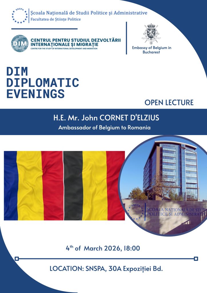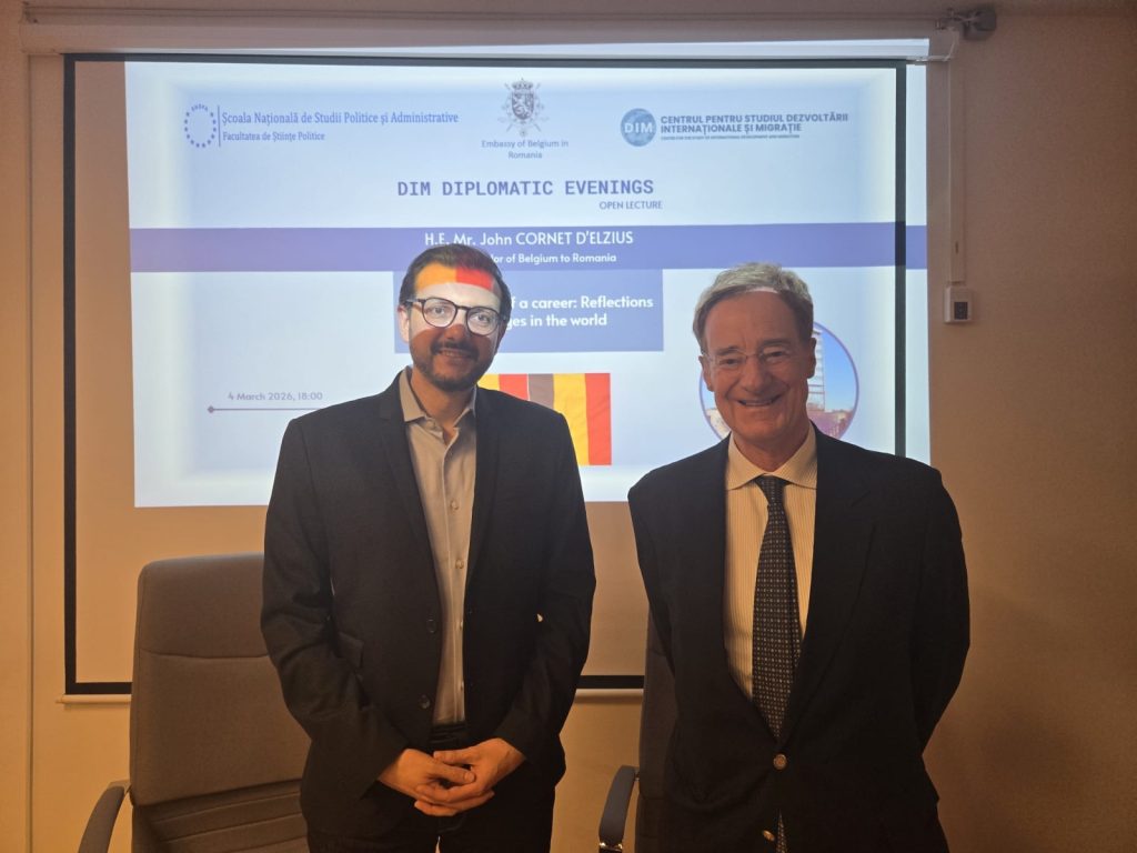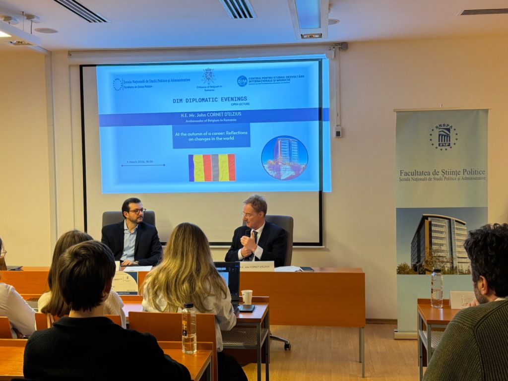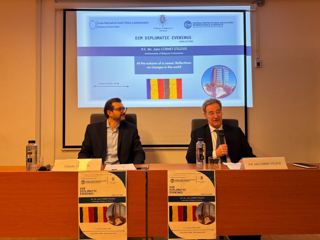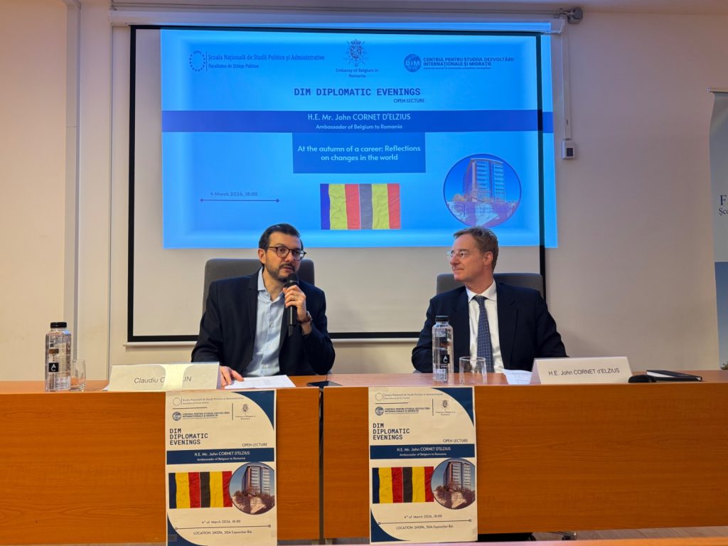 Miercuri, 4 martie 2026, Centrul pentru Studiul Dezvoltării Internaționale și Migrației (DIM), din cadrul SNSPA, a organizat cea de-a patra ediție a seriei Serile Diplomatice, avându-l ca invitat principal pe Excelența Sa, domnul John Cornet d’Elzius, Ambasadorul Regatului Belgiei în România. Evenimentul, moderat de Lect. Dr. Claudiu Crăciun, a reunit studenți, cadre universitare și membri ai comunității diplomatice pentru o discuție dedicată evoluției diplomației și transformărilor sistemului internațional.