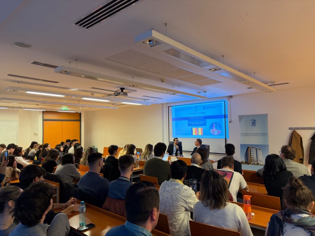 Miercuri, 14 ianuarie 2026, Centrul pentru Studiul Dezvoltării Internaționale și Migrației (DIM) din cadrul SNSPA a organizat cea de-a treia ediție a seriei Seri Diplomatice, reunind studenți și cadre didactice într-o discuție aplicată asupra dinamicilor de securitate europeană și a provocărilor cu care se confruntă democrațiile liberale în contextul internațional actual.